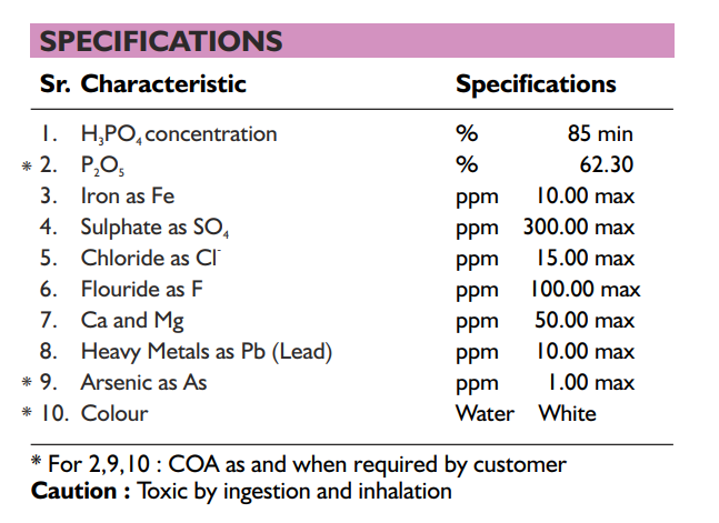 Phosphoric acid is commonly encountered in chemical laboratories as an 85% aqueous solution, which is a colourless, odourless, and non-volatile syrupy liquid. Although it is not classified as a strong acid, the 85% solution can severely irritate the skin and damage the eyes.