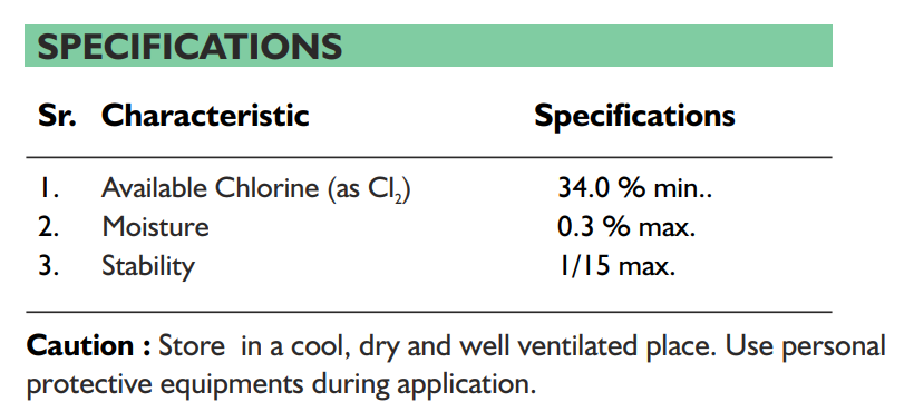 Stable Bleaching Powder is a white powder with available chlorine 34% min, moisture 0.3% max, and stability 1/15 max. It is widely used for disinfection and water treatment.